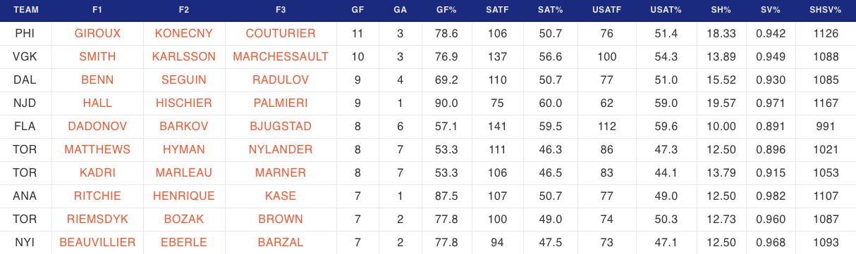 Going back to the chart above the CLAUDE GIROUX/SEAN COUTURIER/TRAVIS KONECNY line has been the most productive line in the NHL over the past 10 games with 11 goals for and 106 shot attempts for. We should also look to Philadelphia’s power play against Montreal tonight.